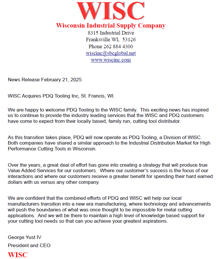 WISC acquires PDQ Tooling, St Francis, WI. See this news release for more details.
